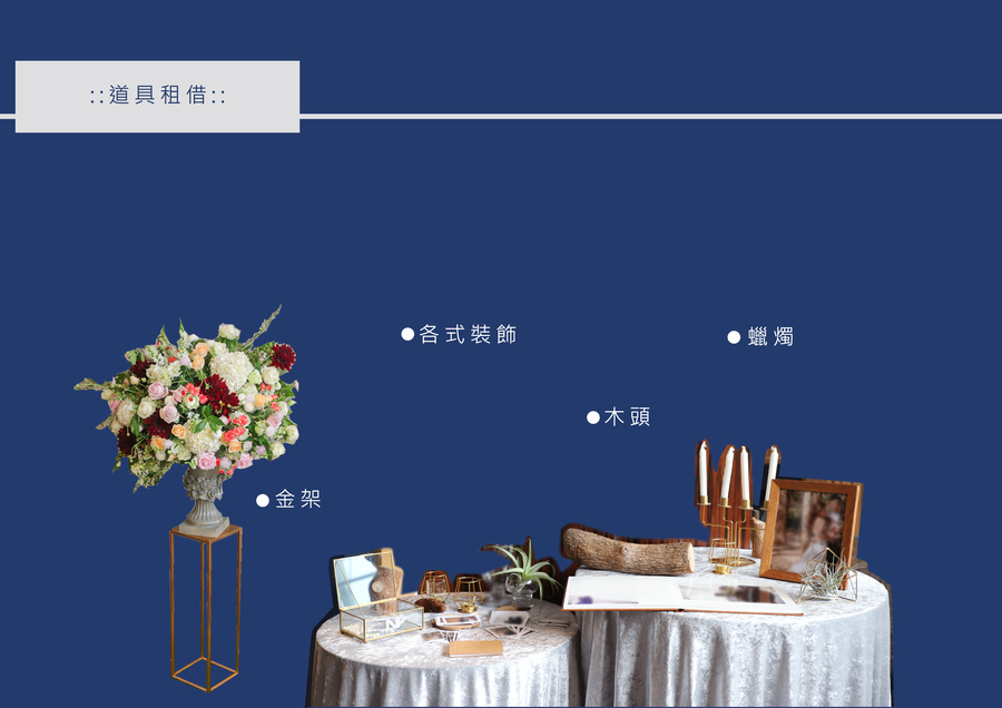道具租借,包含架子、木頭、蠟燭、燭台、相框等等。
